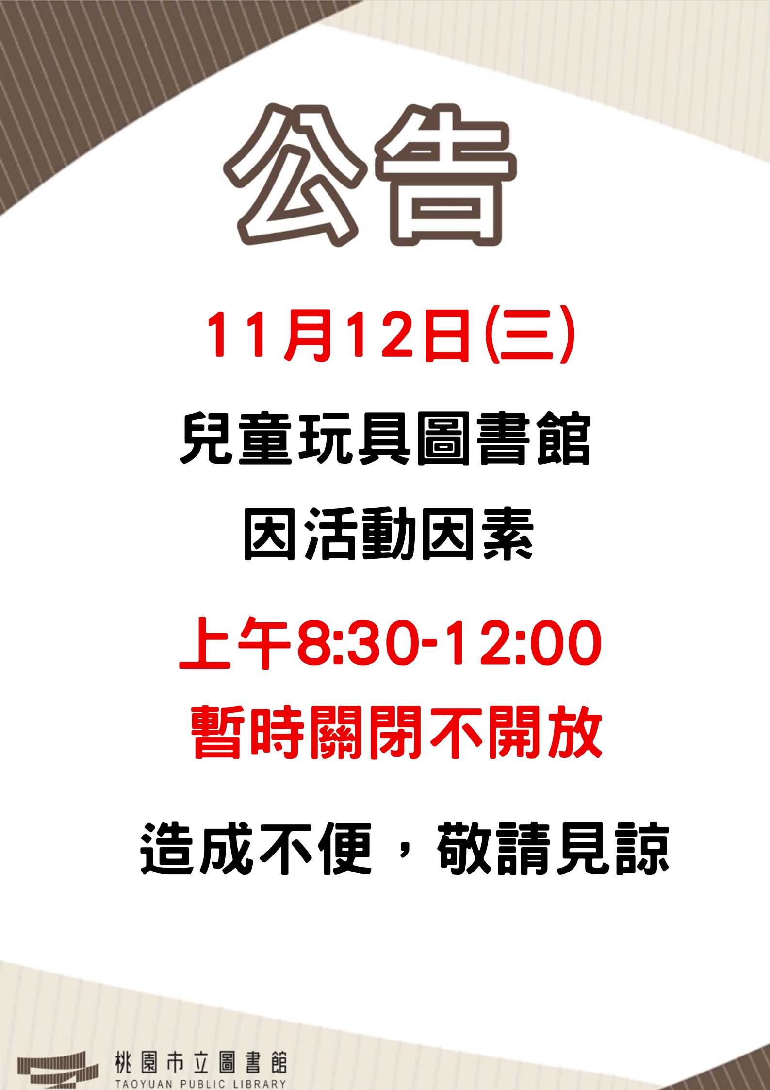 📢 親愛的讀者您好:因活動因素,八德區兒童玩具圖書館將於 114年11月12日(星期二)上午8:30至12:00 暫停開放服務。如需借還書服務,請前往鄰近的 大湳分館(地址:桃園市八德區重慶街53巷2號)。造成您的不便,敬請見諒,感謝您的理解與配合。📍公告單位:桃園市立圖書館兒童玩具館📅 公告日期:114年11月5日📞 洽詢電話:(03)3664066