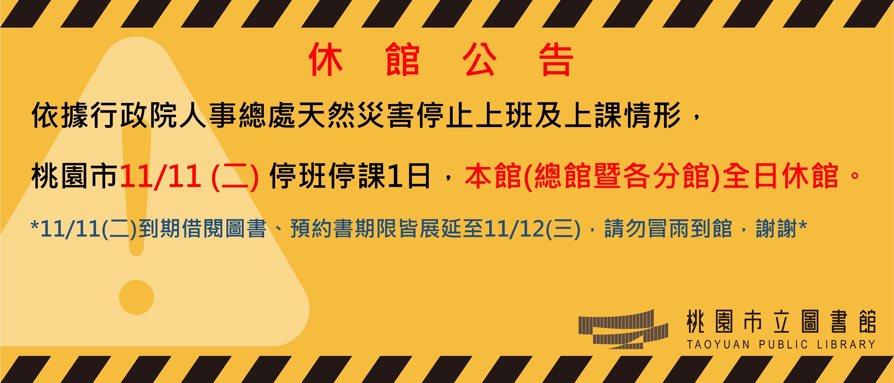 各位親愛的讀者,您好:依據行政院人事總處天然災害停止上班及上課情形,桃園市11/11(二)停班停課1日,本館(總館及各分館)全日休館,請讀者不要白跑一趟。有書到期要歸還或要取預約書者,都會將展延至11/12(三),請不要冒雨到館。颱風天請大家注意安全,在家也可以使用本館電子資源喔!https://hyint.typl.gov.tw/login/桃園市立圖書館 敬啟