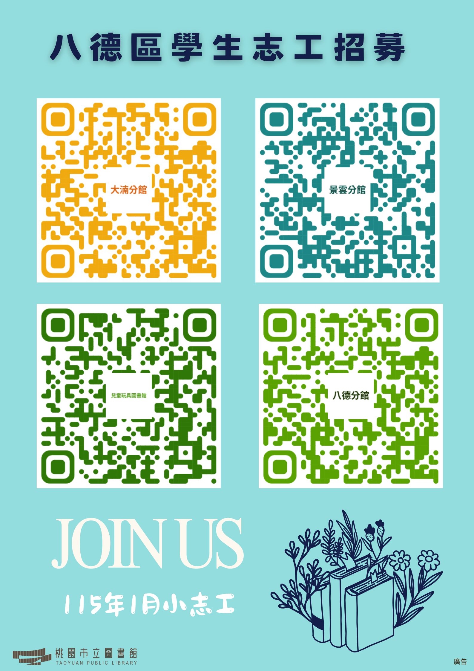 115年01月【八德區分館】學生志工將於114/12/01(一)上午9時開放線上報名