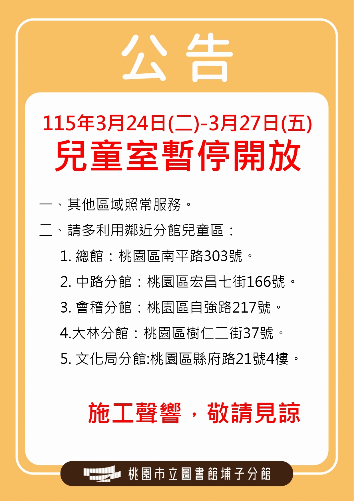埔子分館3/24(二)-3/27(五) 兒童室暫停開放