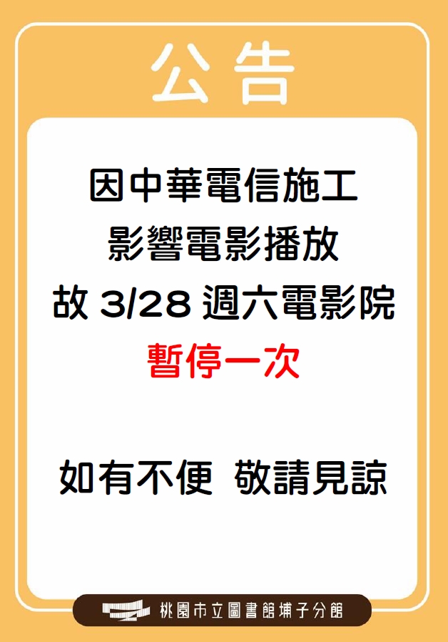 埔子分館3/28(六)因中華電信施工影響 電影播放暫停一次