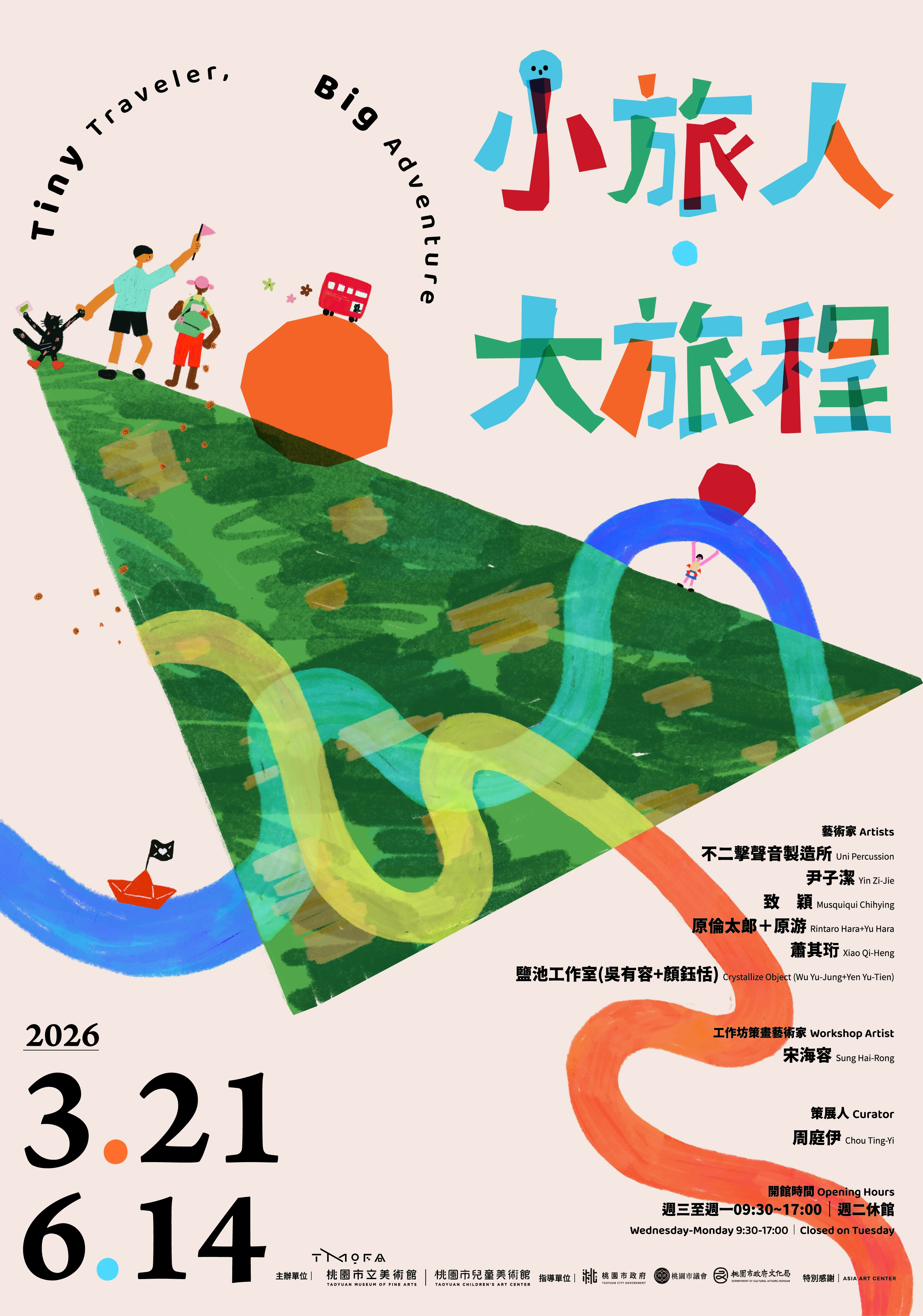 - 為鼓勵兒童在藝術的探索中,學習自我認同,以及喜愛自己 的成長環境,本館特辦理「小旅人·大旅程」特展,邀集6組國內外藝術家,將展覽融入遊戲式的探索設計,以空間裝置、互動體驗等媒介創造感官體驗,邀請小旅人運用觀察力、感受力與想像力完成旅行任務,在參與中逐步展開屬於自己的旅程敘事。