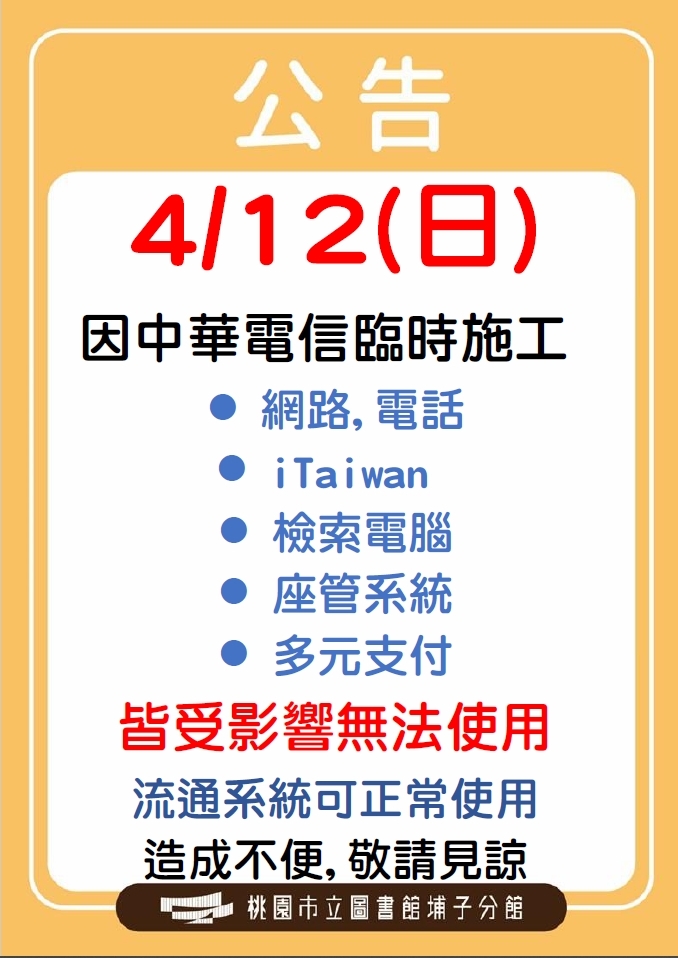 埔子分館4/12(日)因中華電信施工影響網路及電話無法使用