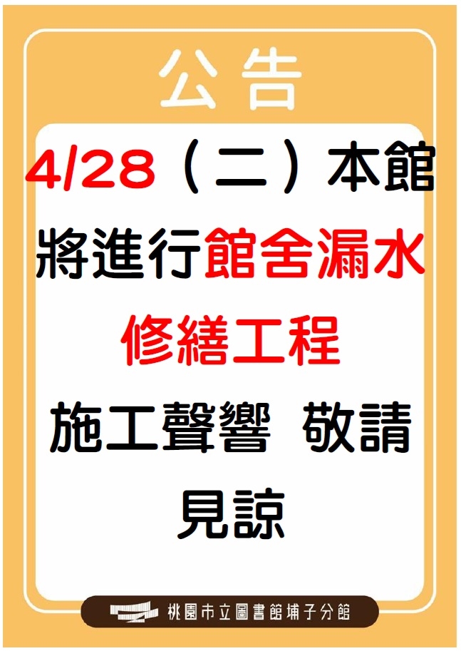 埔子分館4/28(二)進行漏水修繕工程 施工聲響 敬請見諒